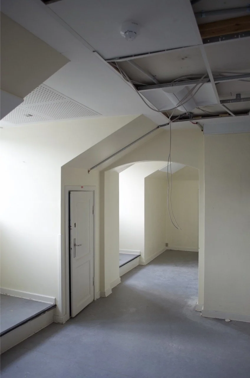 The first stage of this intervention at Baldersgade 24 is to transform the main space using existing materials, such as the ceiling panels left by previous tenants, thereby minimizing the use of new building materials. The reason for this is to accommodate the acute need for space, facilitating treatment fasitilies for people suffering from mental ilnesses, such as stress, depresseion or anxiety.